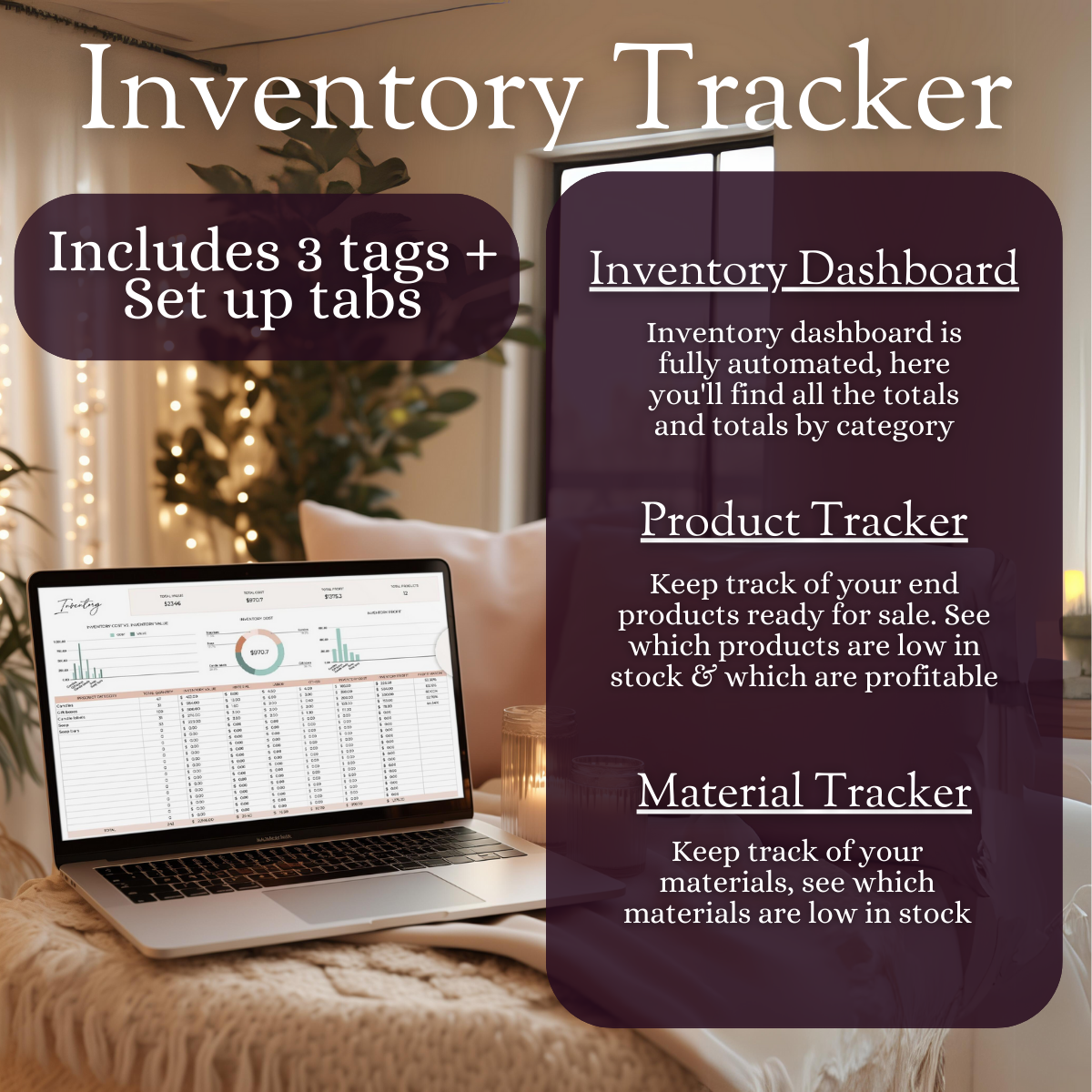 ✔ 4 comprehensive tabs: Setup, Inventory Dashboard, Products, and Materials